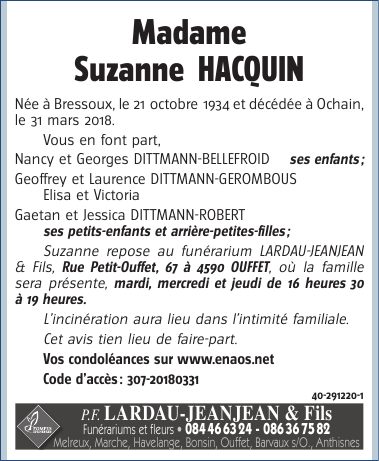 Décédée à Clavier (4560) le samedi 31 mars 2018 à l'âge de 83 ans