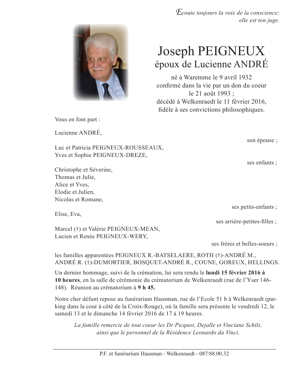 Fallecido en Welkenraedt (4840) el jueves, 11 de febrero de 2016 a la edad de 83 años