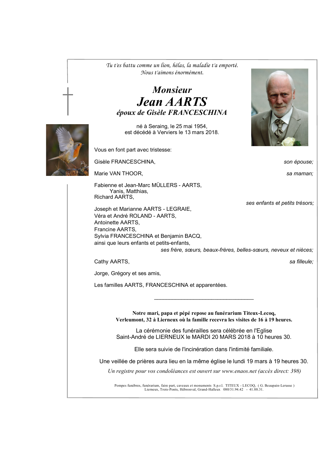 Died in Verviers (4800) on 13 March 2018 at the age of 63 years