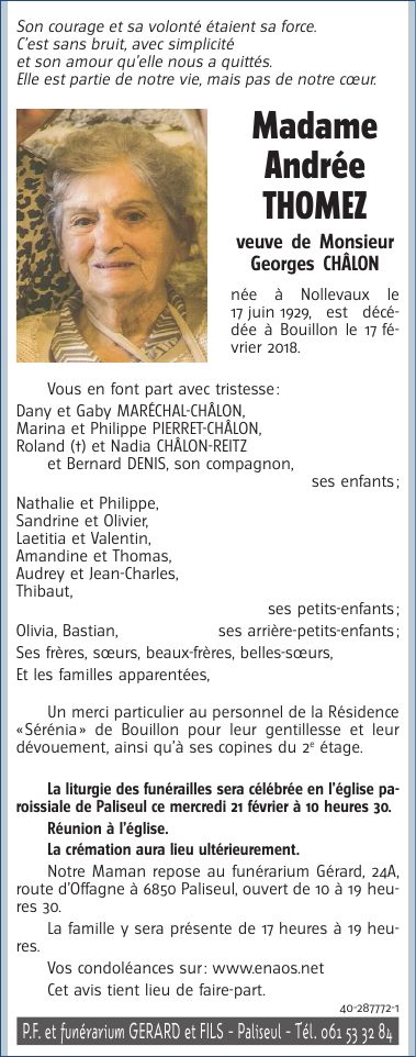 Décédée à Bouillon (6830) le samedi 17 février 2018 à l'âge de 88 ans
