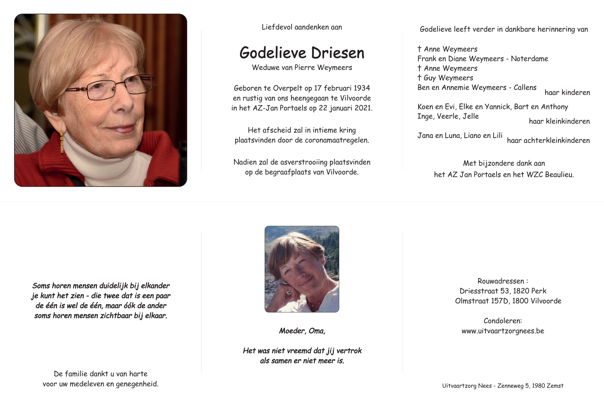 Décédée à Vilvoorde (1800) le vendredi 22 janvier 2021 à l'âge de 86 ans