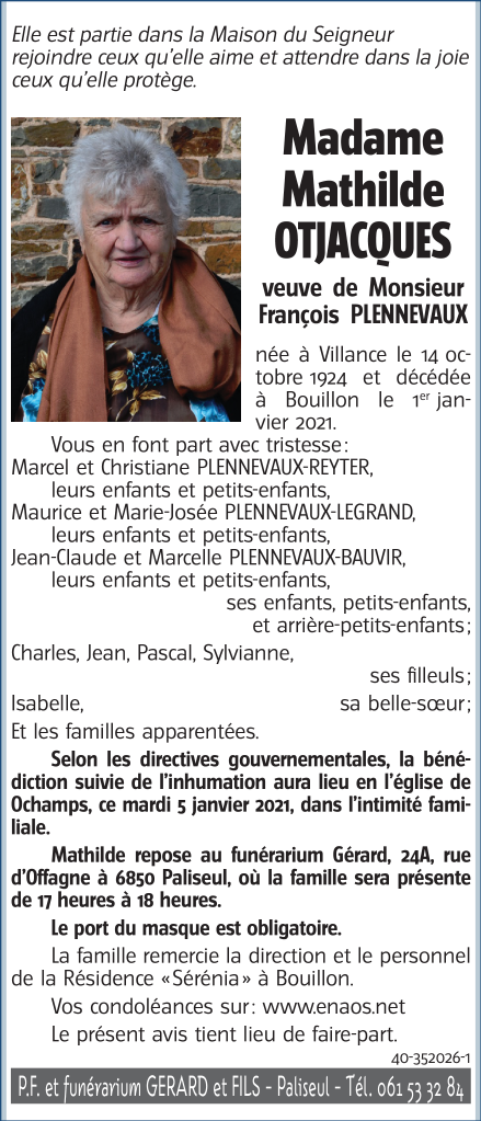 Décédée à Bouillon (6830) le vendredi 1 janvier 2021 à l'âge de 96 ans