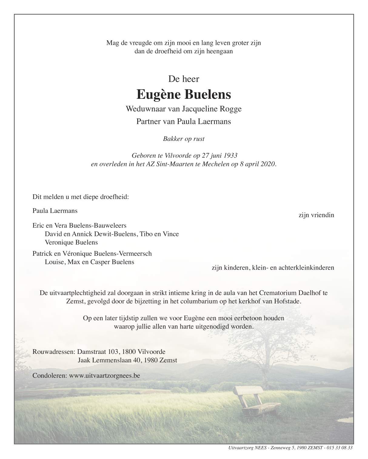 Décédé à Mechelen (2800) le mercredi 8 avril 2020 à l'âge de 86 ans
