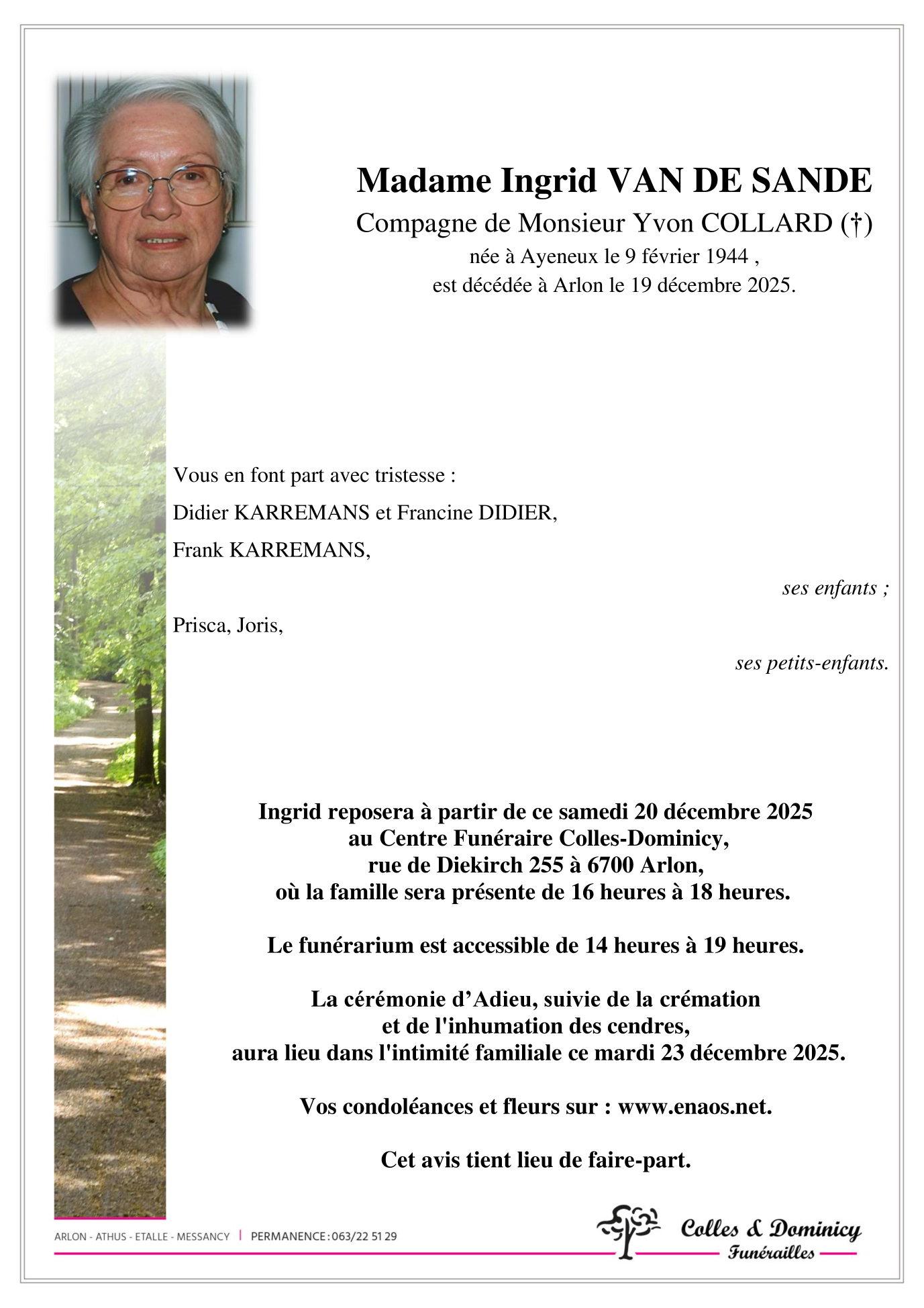 Décédée à Arlon (6700) le vendredi 19 décembre 2025 à l'âge de 81 ans