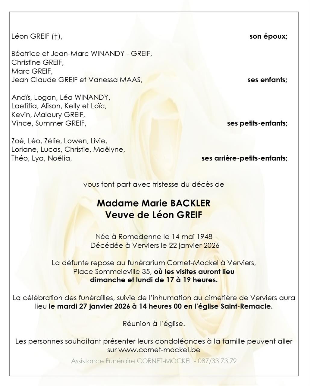 Décédée à Verviers (4800) le jeudi 22 janvier 2026 à l'âge de 77 ans