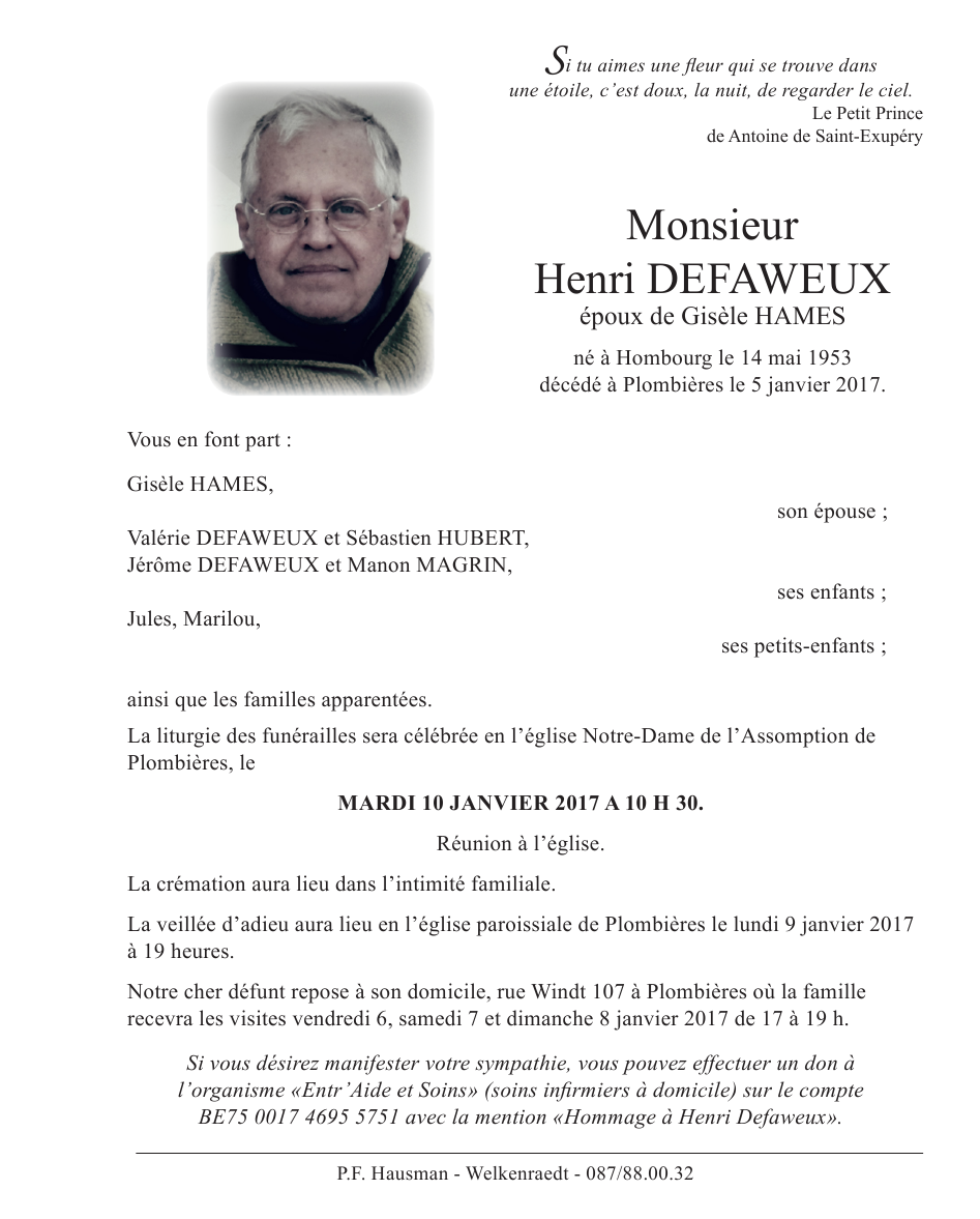 Fallecido en Plombières (4850) el jueves, 5 de enero de 2017 a la edad de 63 años