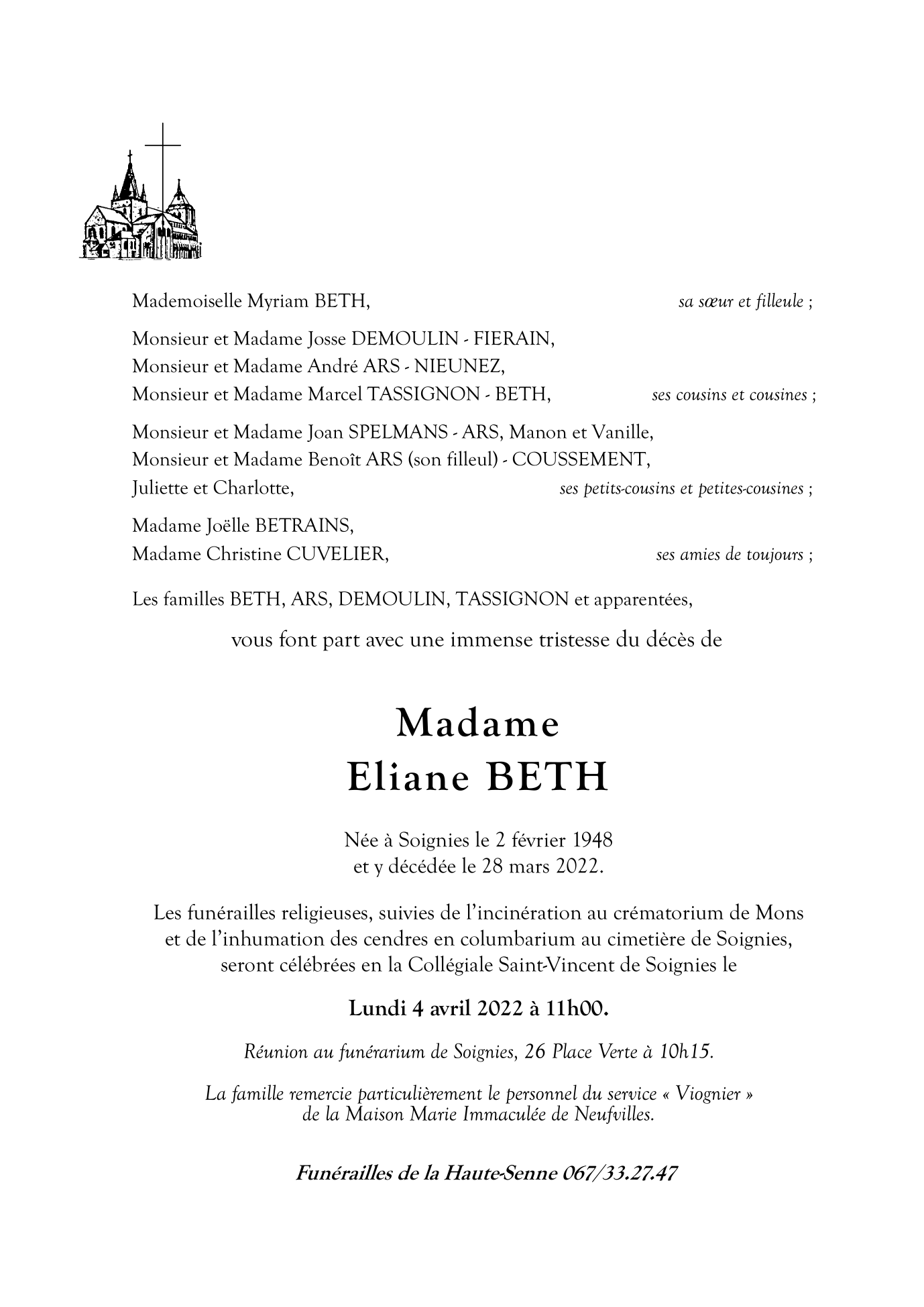 Fallecida en Soignies (7060) el lunes, 28 de marzo de 2022 a la edad de 74 años