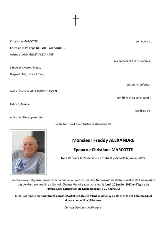 Décédé à Verviers (4800) le jeudi 6 janvier 2022 à l'âge de 77 ans