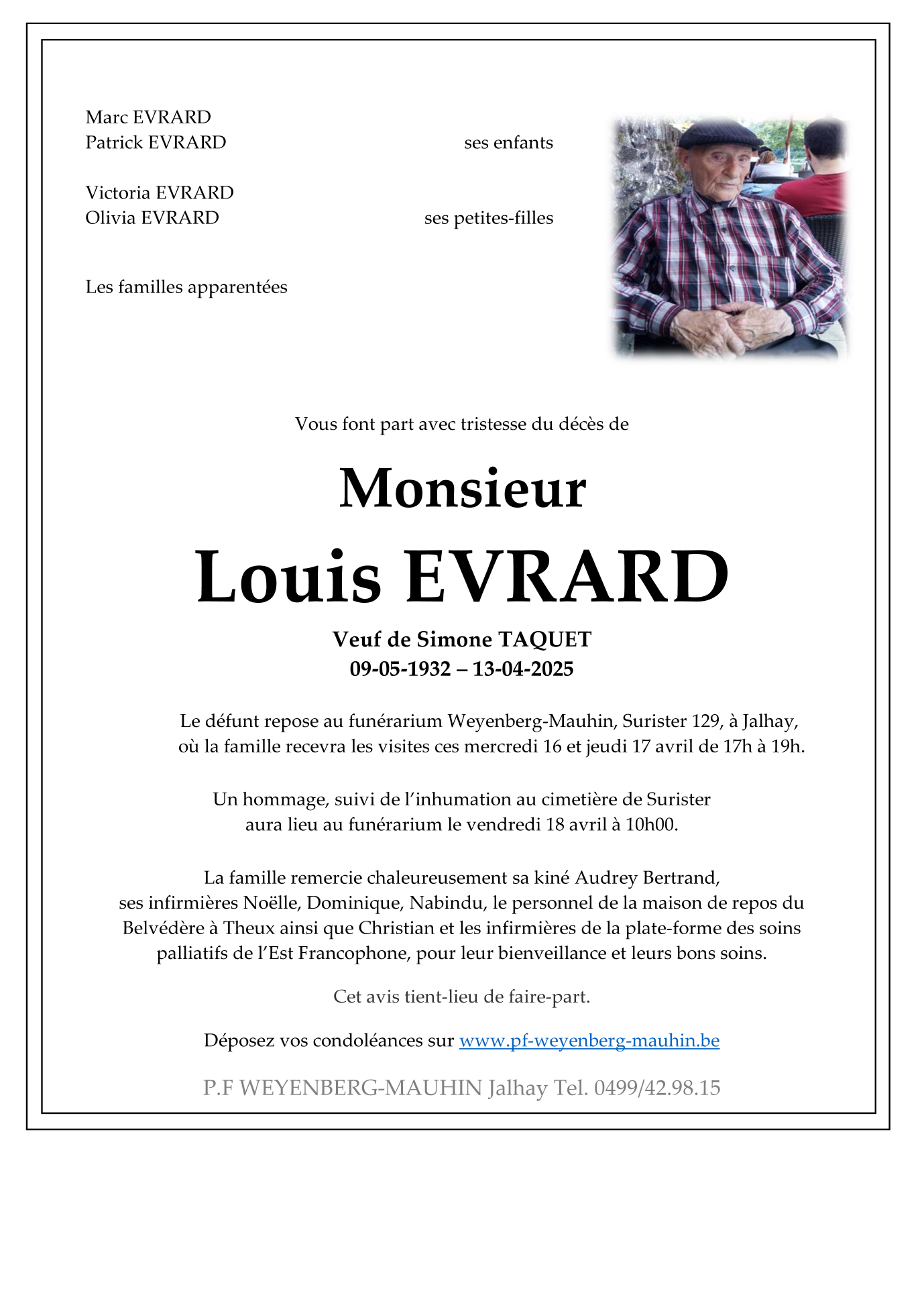 Décédé à Jalhay (4845) le dimanche 13 avril 2025 à l'âge de 92 ans