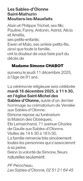 Décédée à Les Sables d'Olonne (85100, France) le jeudi 11 décembre 2025 à l'âge de 91 ans