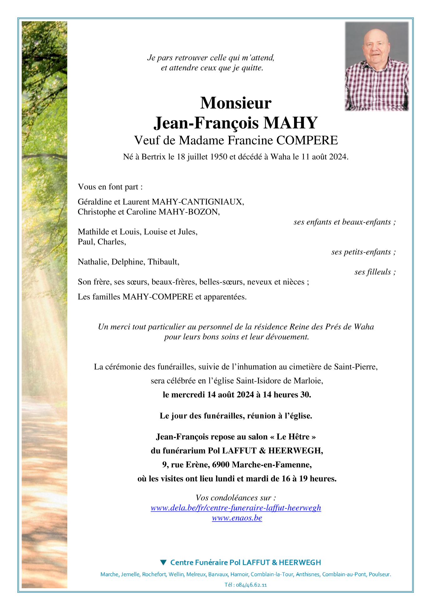 Décédé à Waha (6900) le dimanche 11 août 2024 à l'âge de 74 ans
