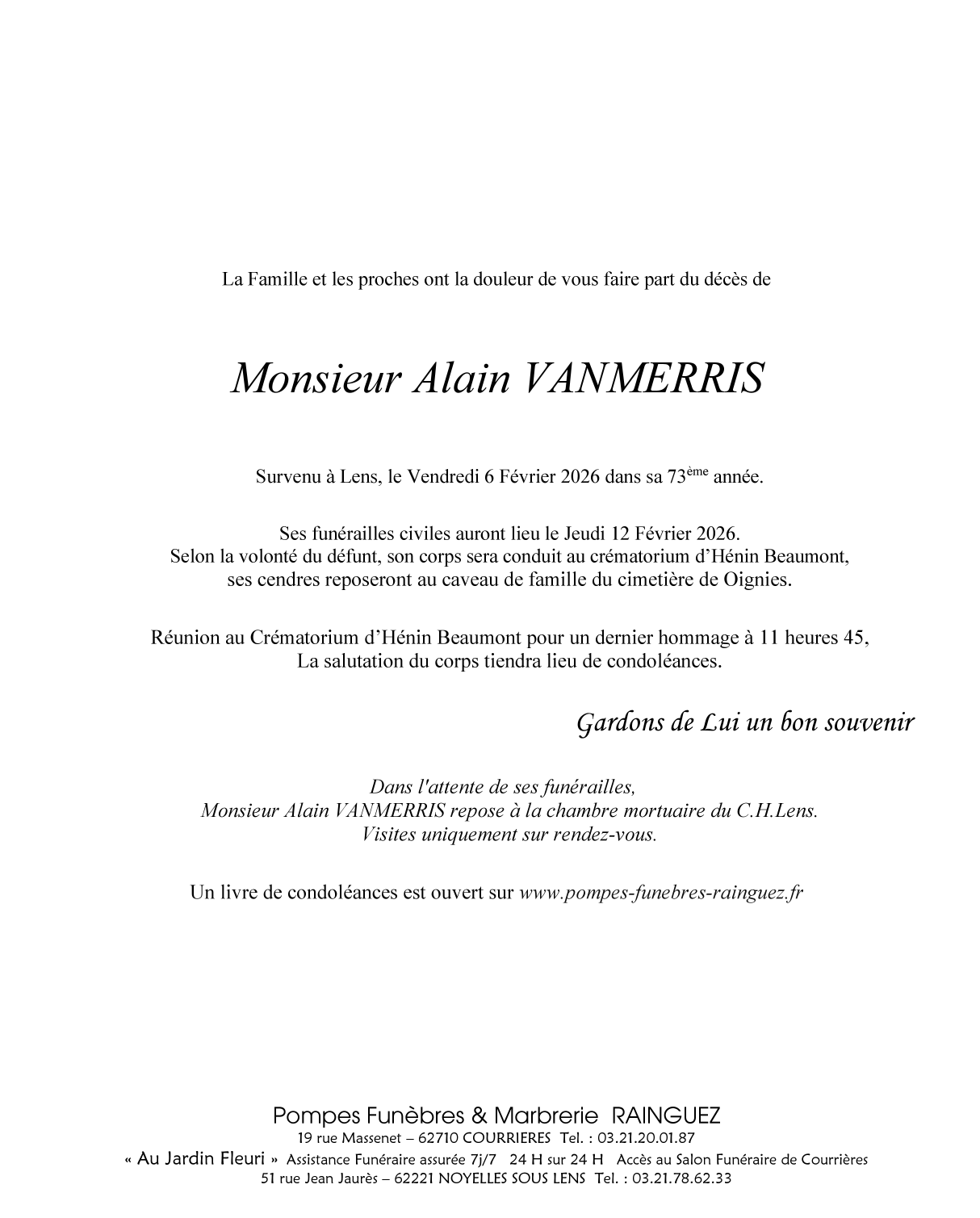 Died in Lens (62300, France) on 06 February 2026 at the age of 72 years