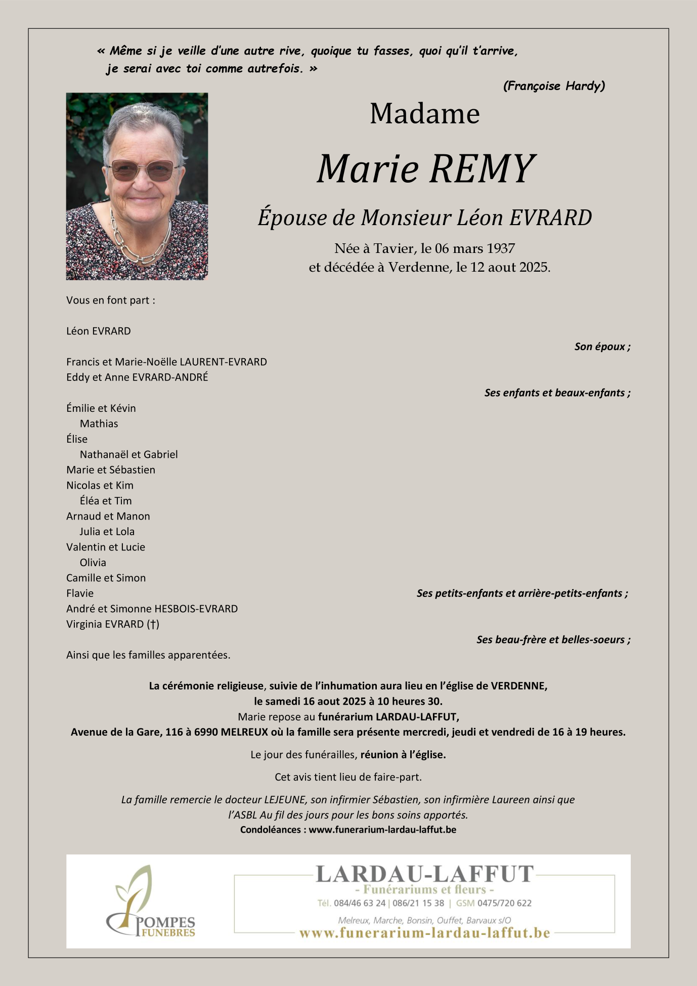 Décédée à Verdenne (6900) le mardi 12 août 2025 à l'âge de 88 ans
