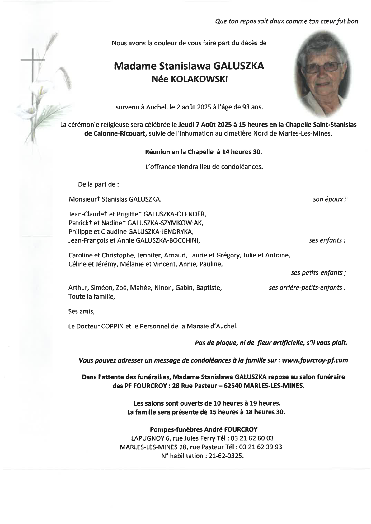Fallecida en Auchel (62260, Francia) el sábado, 2 de agosto de 2025 a la edad de 93 años