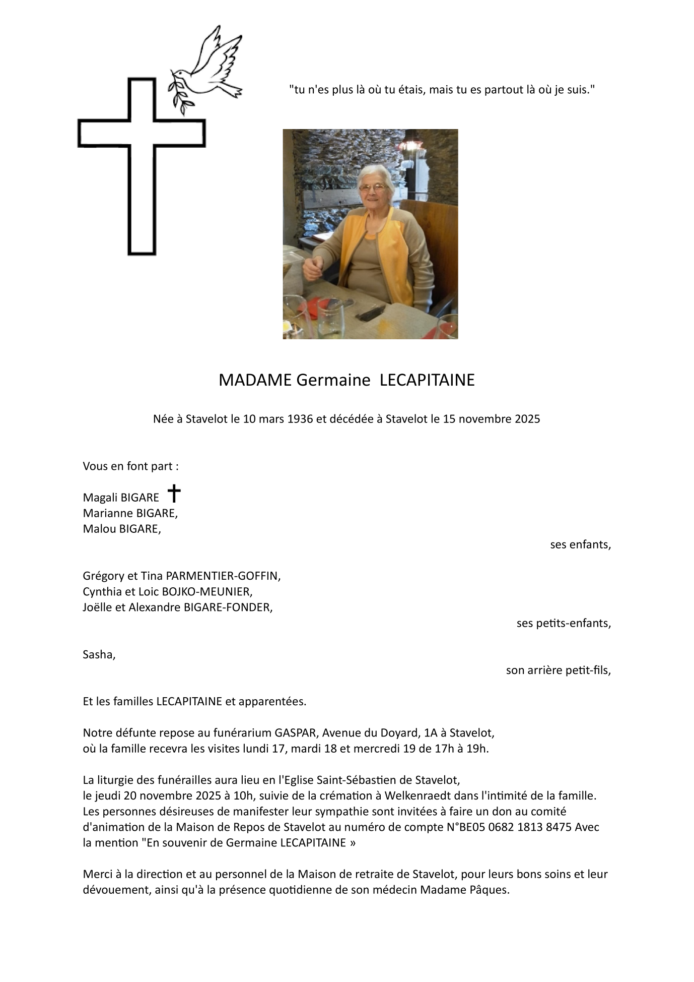 Décédée à Stavelot (4970) le samedi 15 novembre 2025 à l'âge de 89 ans