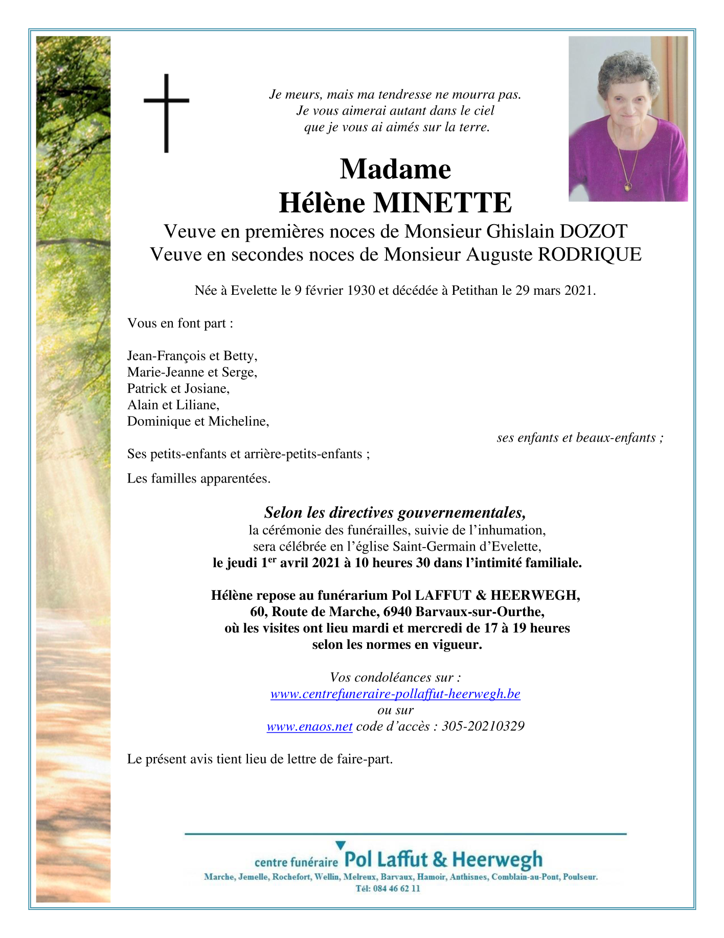 Died in Petit-Han (6940) on 29 March 2021 at the age of 91 years