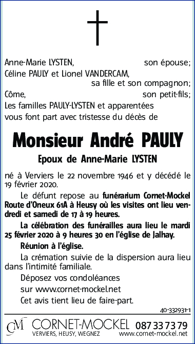 Décédé à Heusy (4802) le mercredi 19 février 2020 à l'âge de 73 ans