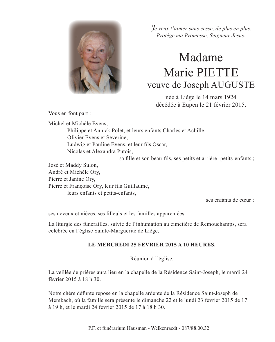 Décédée à Eupen (4700) le samedi 21 février 2015 à l'âge de 90 ans