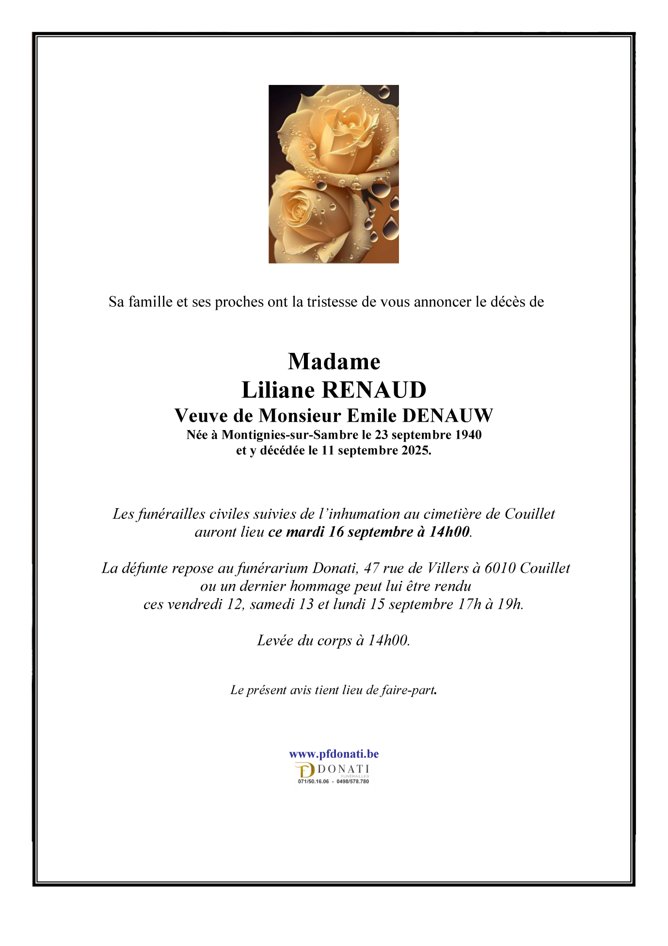 Décédée à Montignies-sur-Sambre (6061) le jeudi 11 septembre 2025 à l'âge de 84 ans