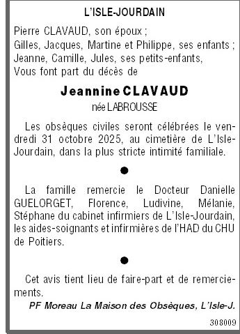 Décédée à L'Isle-Jourdain (86150, France) le mardi 28 octobre 2025 à l'âge de 87 ans