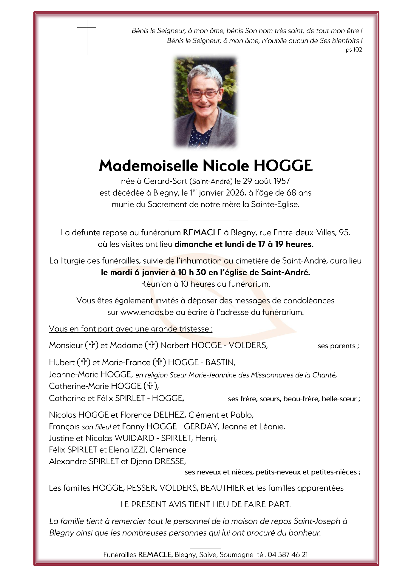 Décédée à Blegny (4670) le jeudi 1 janvier 2026 à l'âge de 68 ans