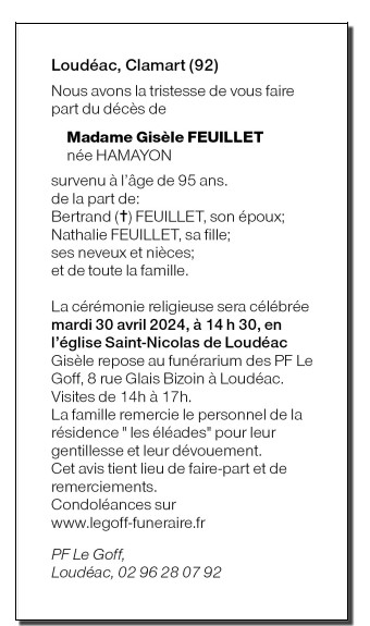 Died in Loudéac (22600, France) on 28 April 2024 at the age of 95 years