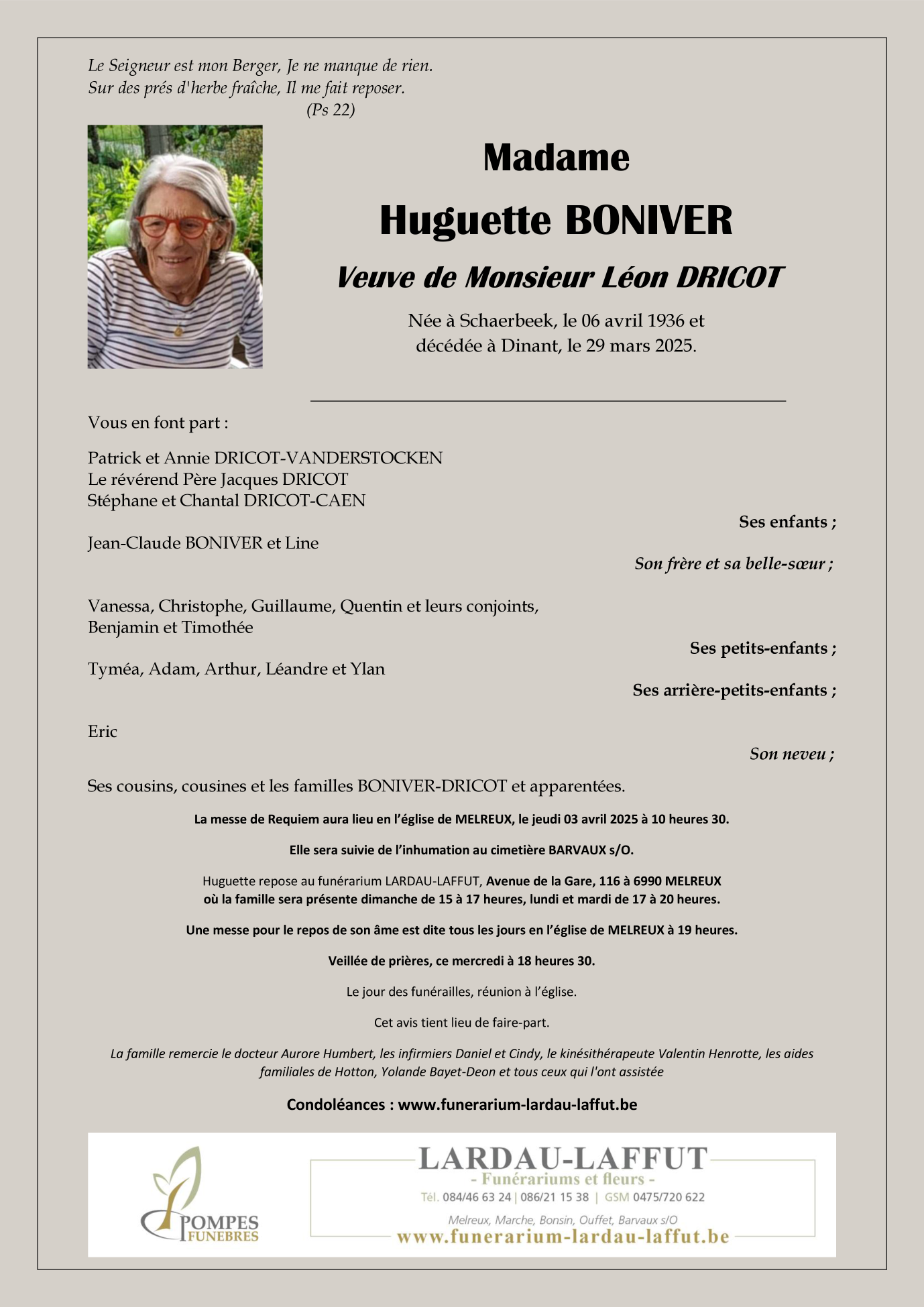 Décédée à Dinant (5500) le samedi 29 mars 2025 à l'âge de 88 ans