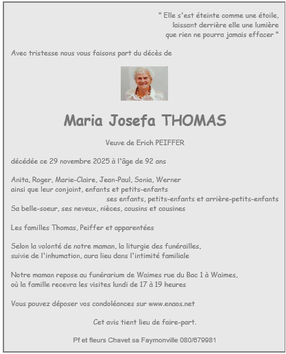 Fallecida en Saint-Vith (4780) el sábado, 29 de noviembre de 2025 a la edad de 92 años