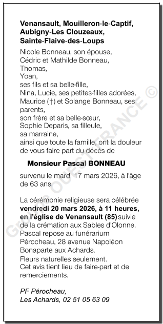 Décédé à Venansault (85190, France) le mardi 17 mars 2026 à l'âge de 63 ans