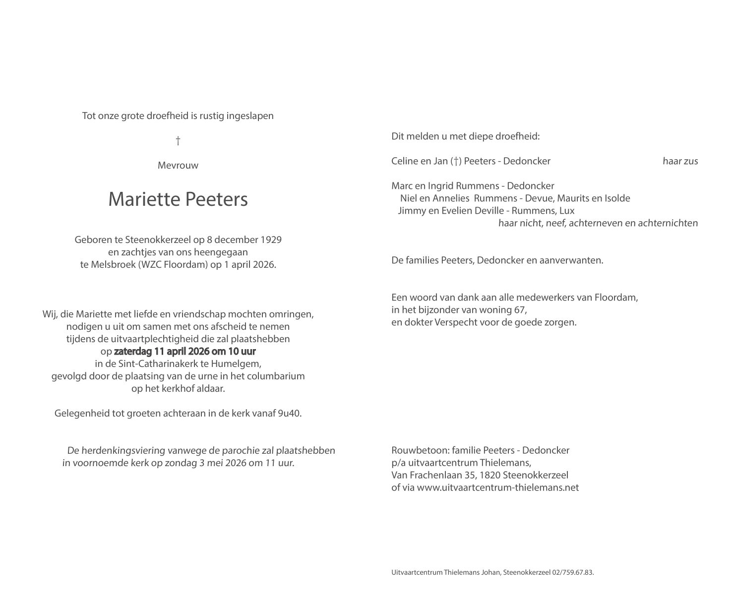 Décédée à Melsbroek (1820) le mercredi 1 avril 2026 à l'âge de 96 ans