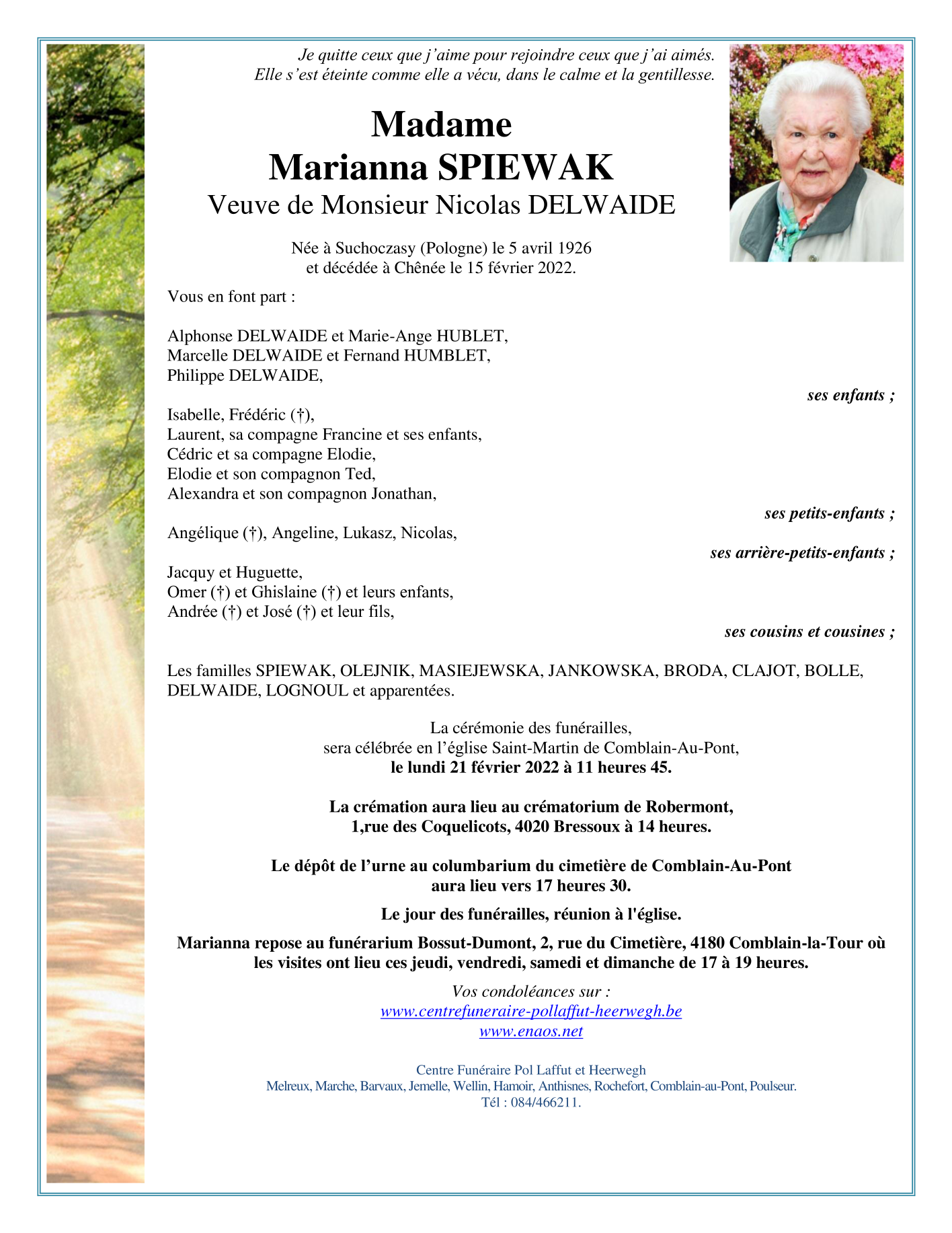 Died in Chênée (4032) on 15 February 2022 at the age of 95 years