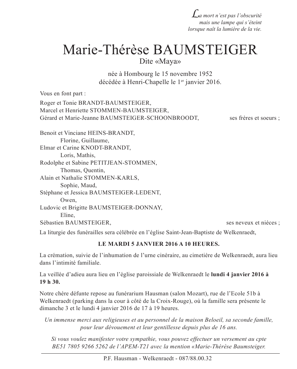 Died in Henri-Chapelle (4841) on 01 January 2016 at the age of 63 years