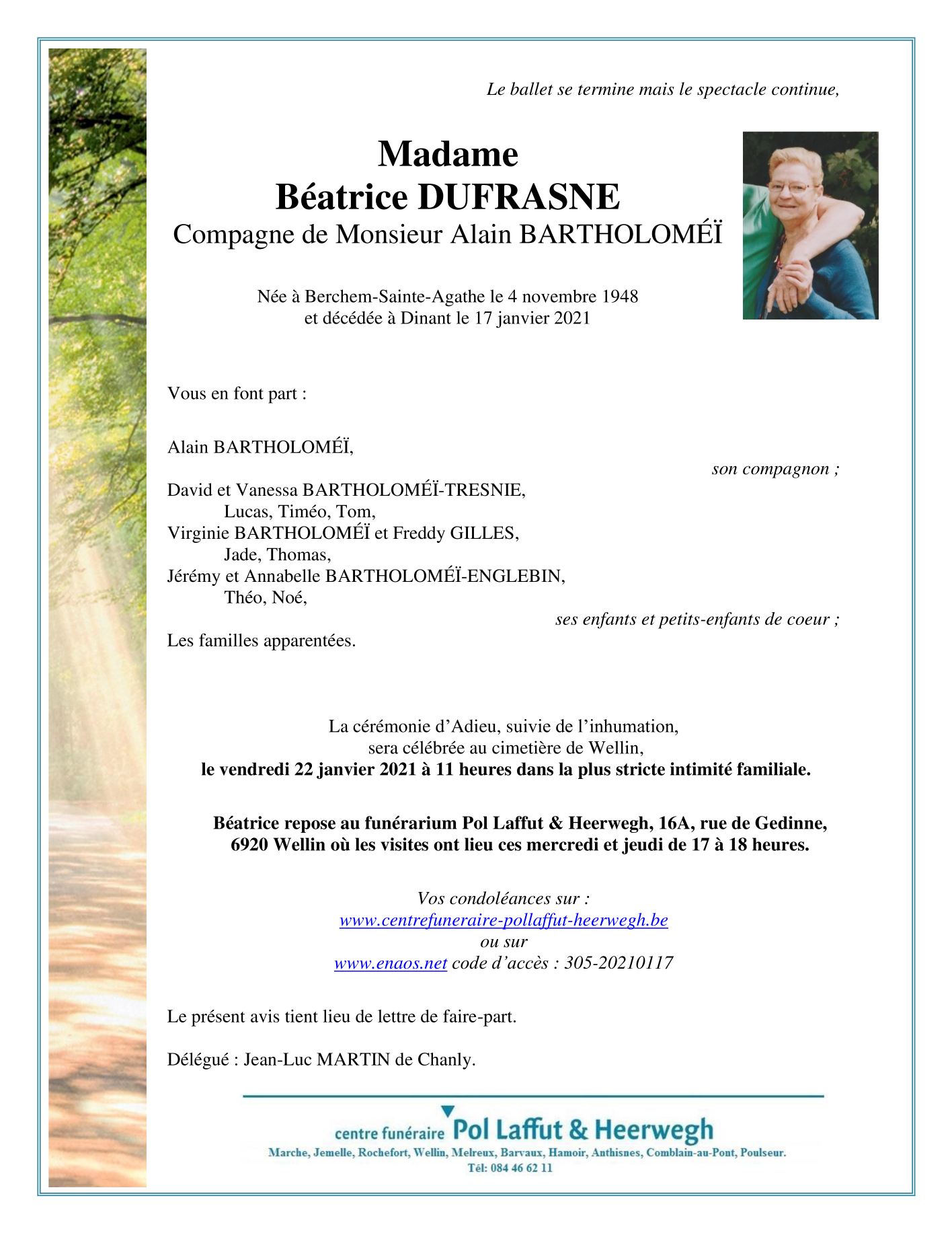 Décédée à Dinant (5500) le dimanche 17 janvier 2021 à l'âge de 72 ans