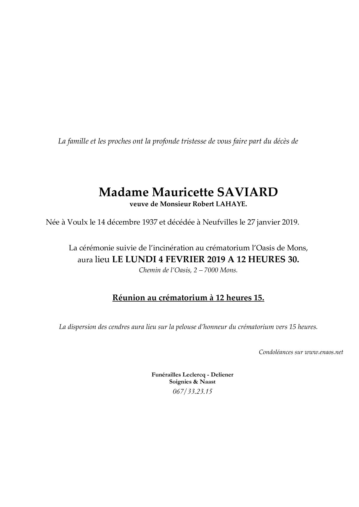 Died in Neufvilles (7063) on 27 January 2019 at the age of 81 years