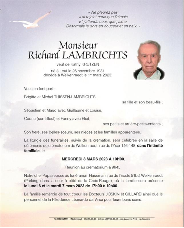 Décédé à Welkenraedt (4840) le mercredi 1 mars 2023 à l'âge de 91 ans
