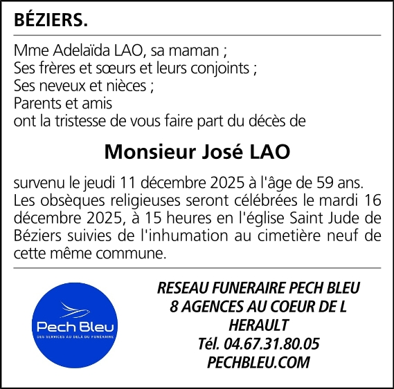 Décédé à Béziers (34500, France) le jeudi 11 décembre 2025 à l'âge de 59 ans