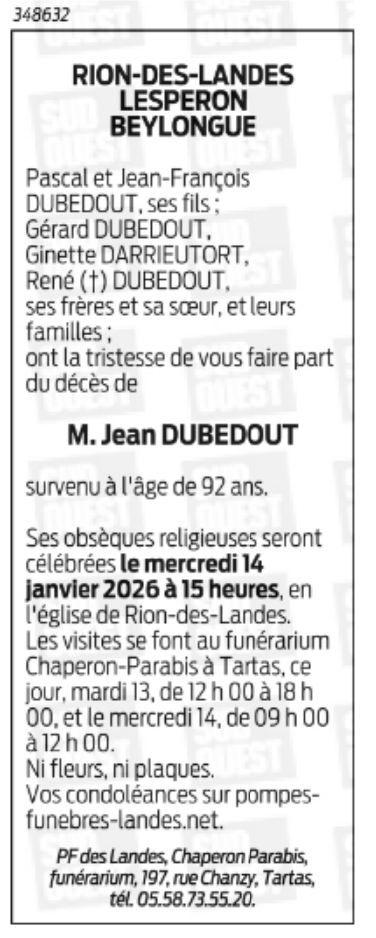 Décédé à Morcenx (40110, France) le dimanche 11 janvier 2026 à l'âge de 92 ans