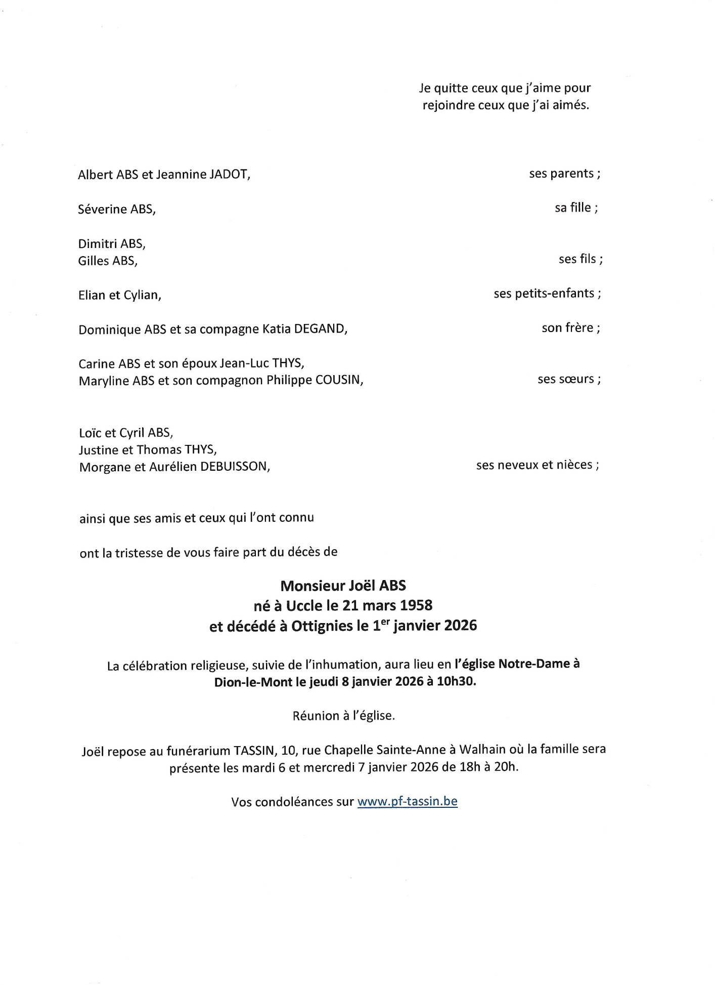 Décédé à Ottignies (1340) le jeudi 1 janvier 2026 à l'âge de 67 ans