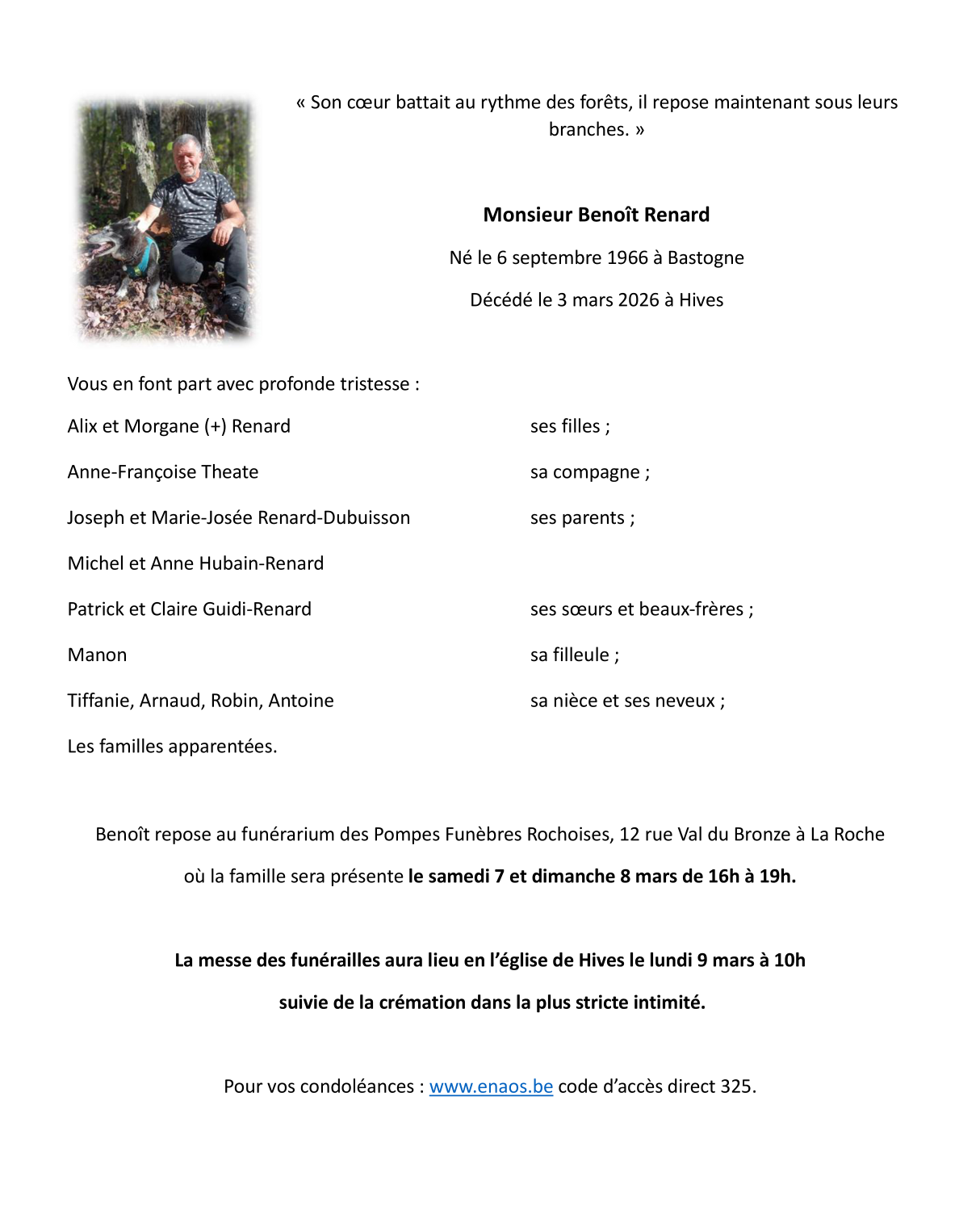 Décédé à Hives (6984) le mardi 3 mars 2026 à l'âge de 59 ans