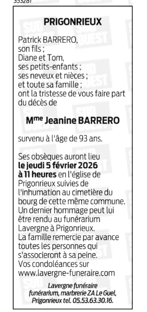 Décédée à Bergerac (24100, France) le lundi 2 février 2026 à l'âge de 93 ans