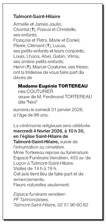 Décédée à Talmont-Saint-Hilaire (85440, France) le samedi 31 janvier 2026 à l'âge de 96 ans