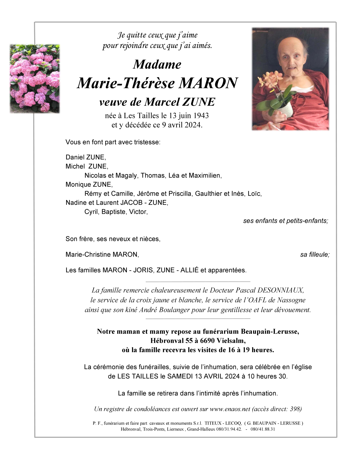 Overleden te Les Tailles (6661) op dinsdag 9 april 2024 op 80-jarige leeftijd