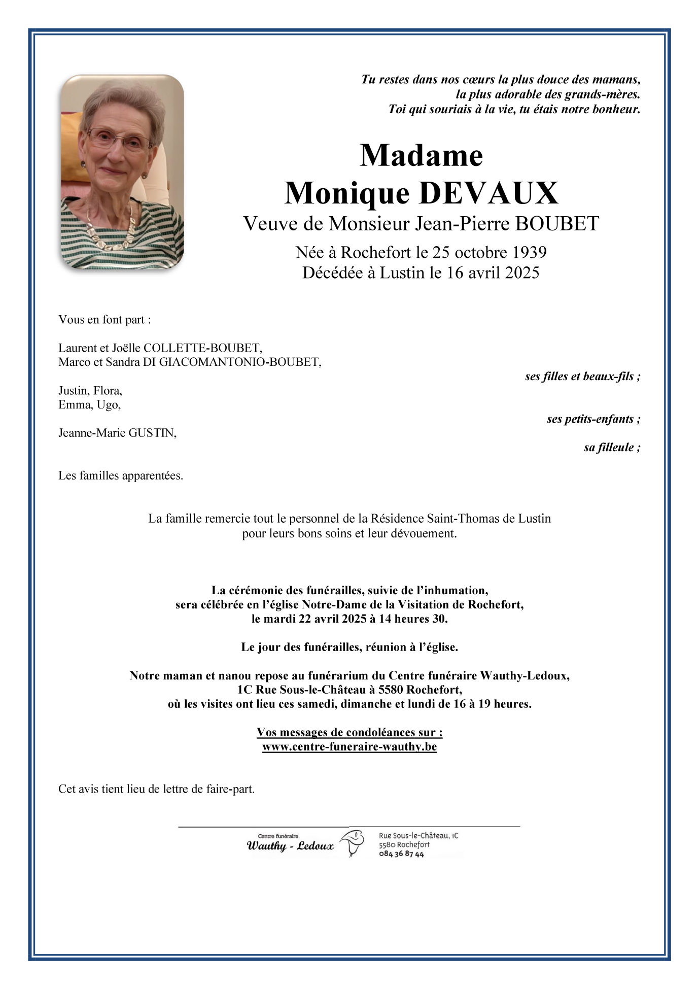 Died in Lustin (5170) on 16 April 2025 at the age of 85 years
