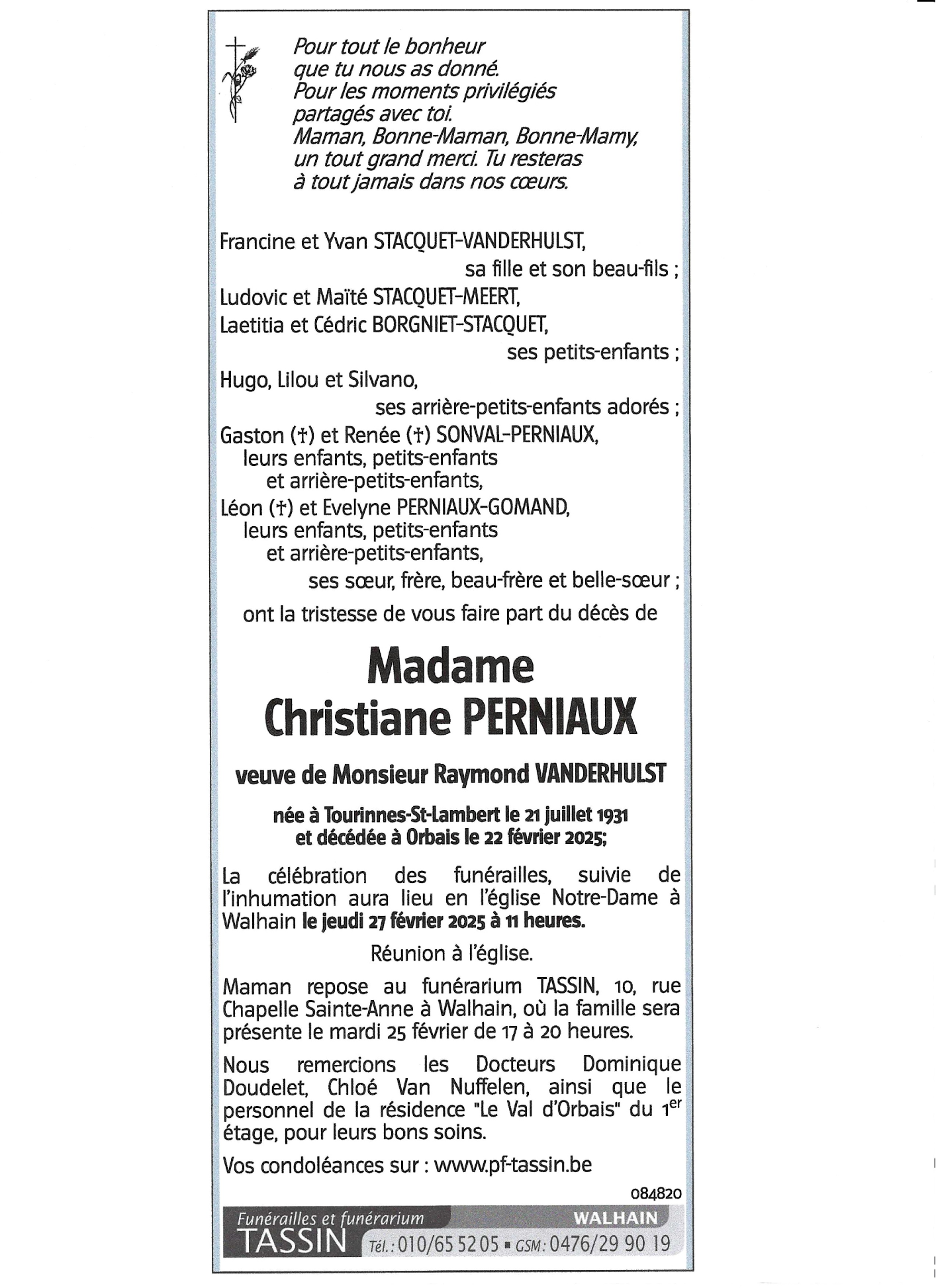 Décédée à Orbais (1360) le samedi 22 février 2025 à l'âge de 93 ans