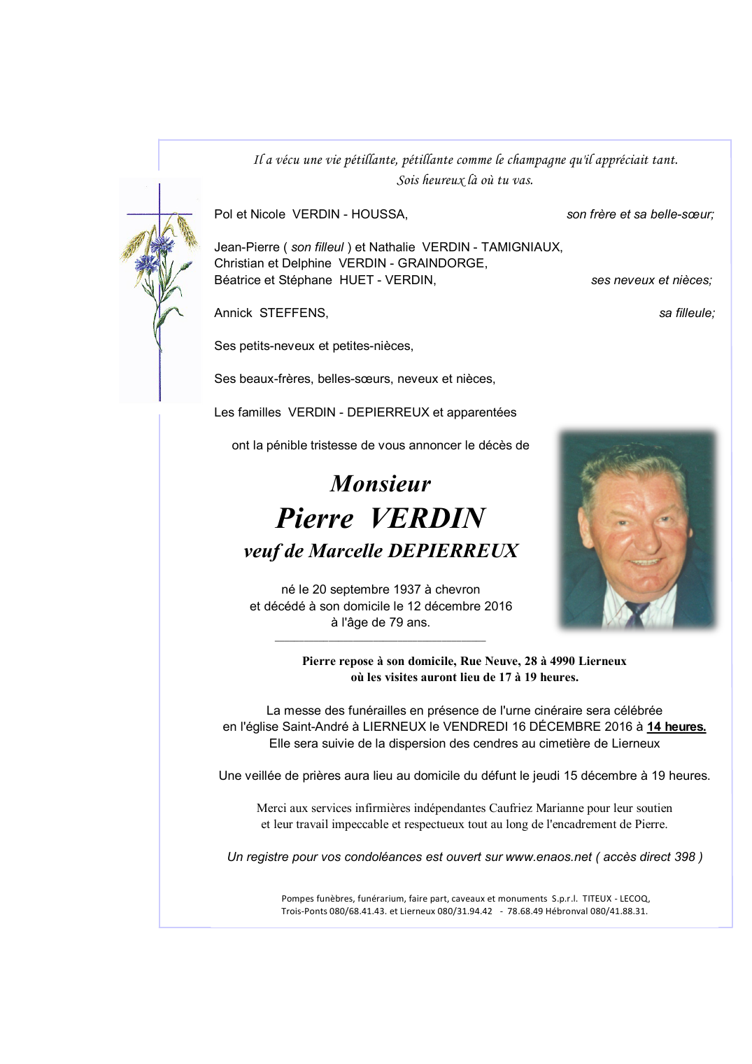 Died in Lierneux (4990) on 12 December 2016 at the age of 79 years