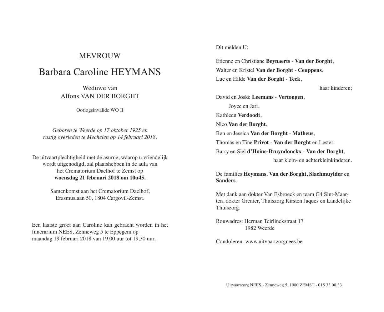 Décédée à Mechelen (2800) le mercredi 14 février 2018 à l'âge de 92 ans