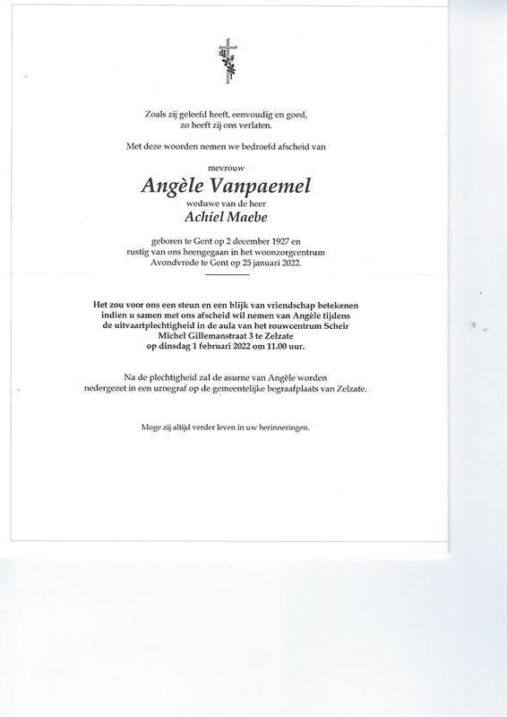 Décédée à Gent (9000) le mardi 25 janvier 2022 à l'âge de 94 ans