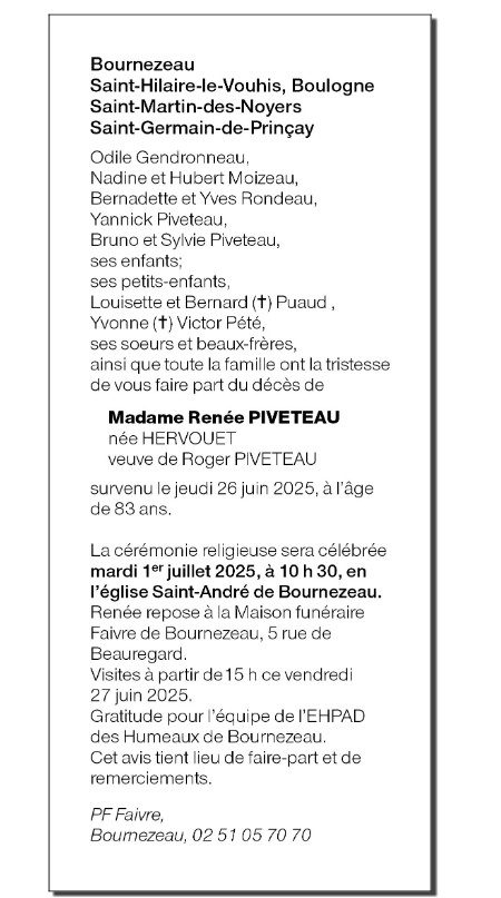 Fallecida en Bournezeau (85480, Francia) el jueves, 26 de junio de 2025 a la edad de 83 años