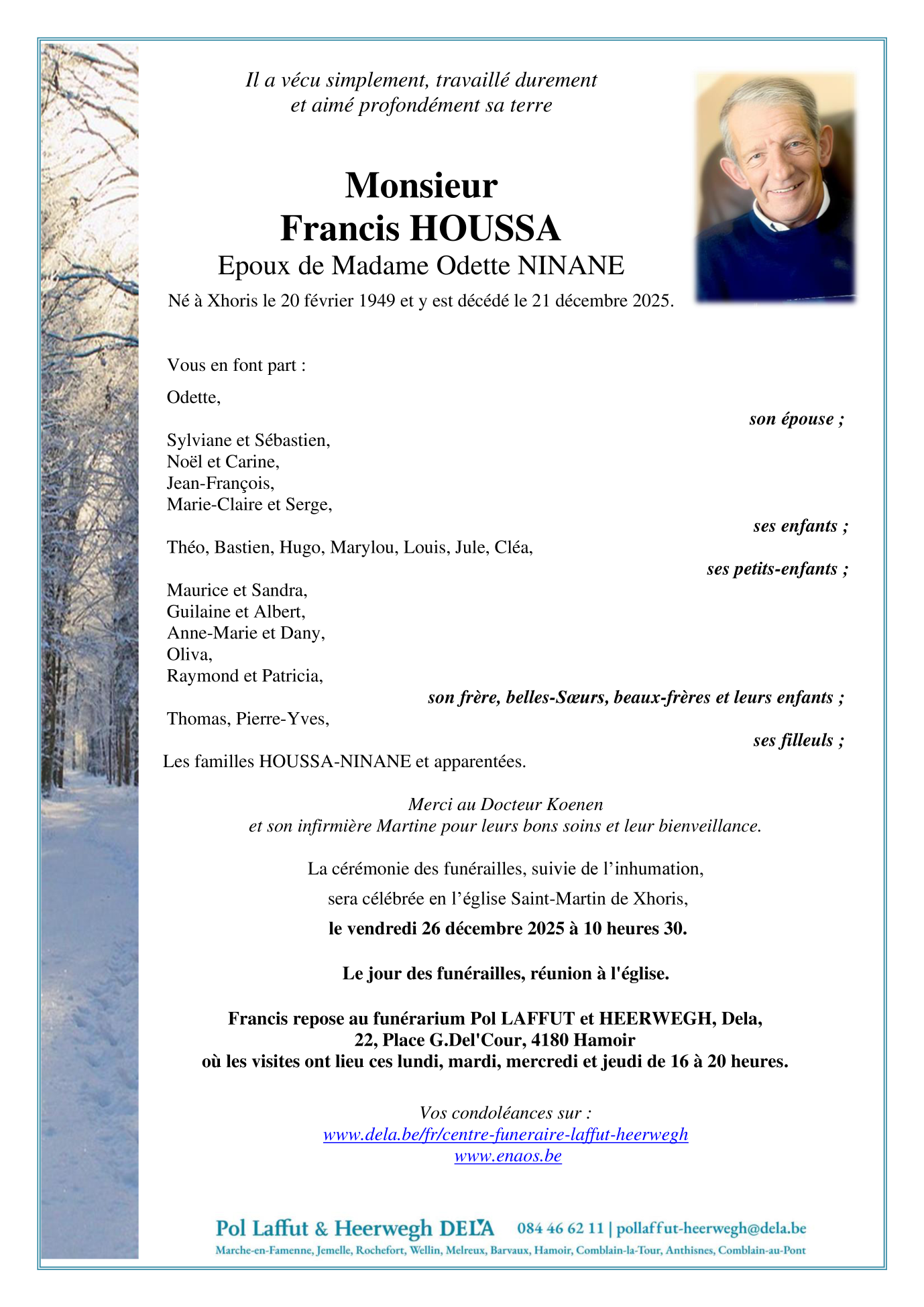Décédé à Xhoris (4190) le lundi 22 décembre 2025 à l'âge de 76 ans