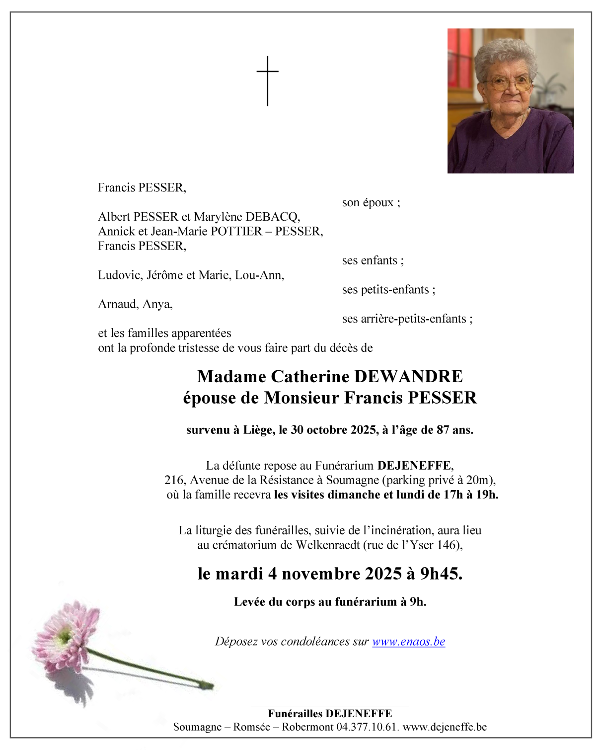 Décédée à Liège (4000) le jeudi 30 octobre 2025 à l'âge de 87 ans
